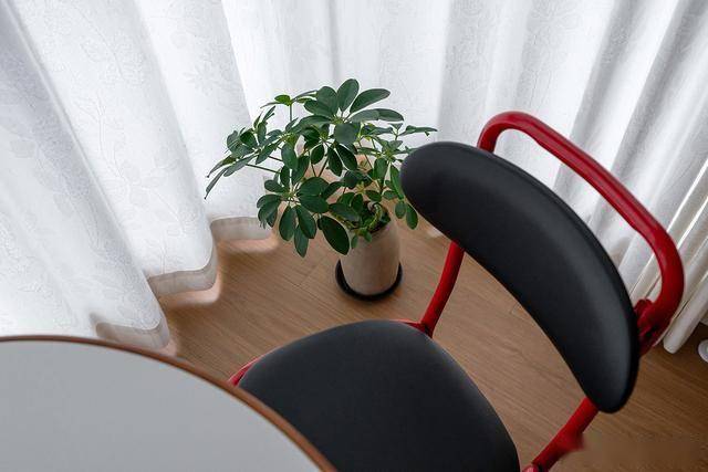 小小的阳台布置成休闲区,带滚轮的圆桌和单椅,方便移动,当阳光穿过白色纱帘,滤出柔和的光线,让不同色彩融合的很高级。