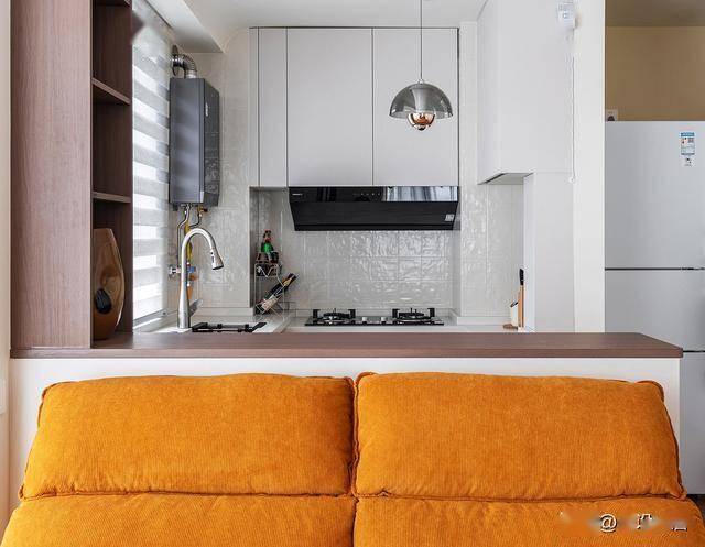 厨房与客厅之间做半墙,这样吃饭、下厨都可以看电视,亲友来访也可以随时互动,而整体的浅色基调,通过暖白、米白和木色的搭配,给人明亮温馨的视觉体验,完美地解决了小户型产生的拥挤和局促感。